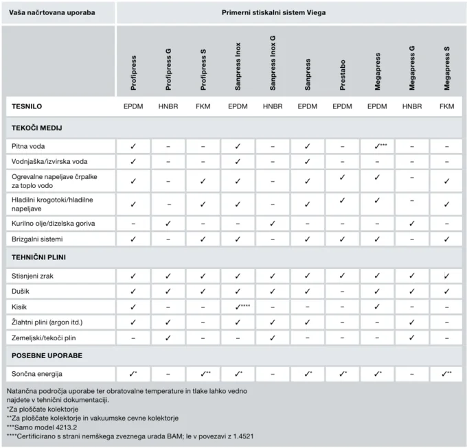 Fitingi Viega so tipsko opremljeni s tesnilnimi elementi, ki so prilagojena različnim področjim uporabe: