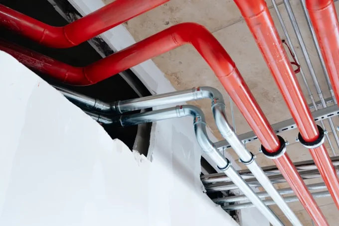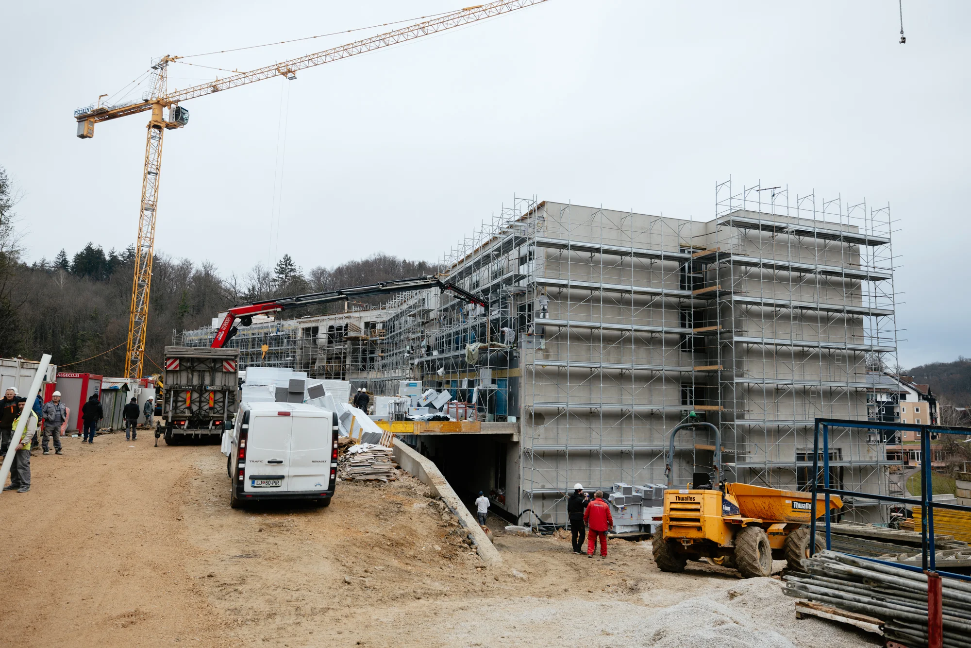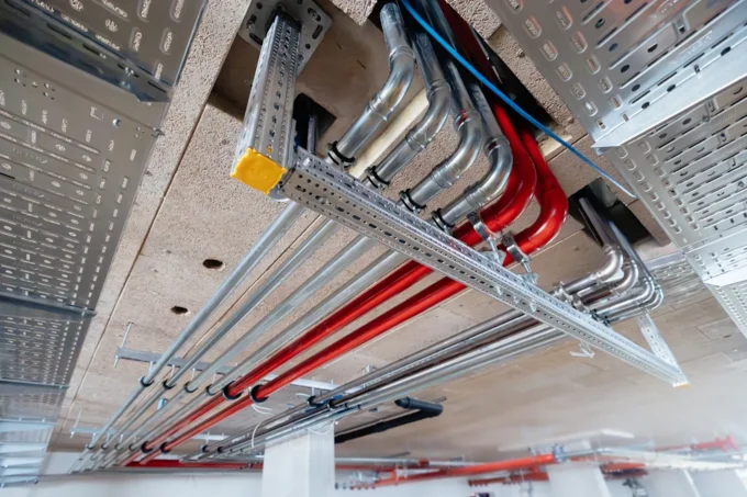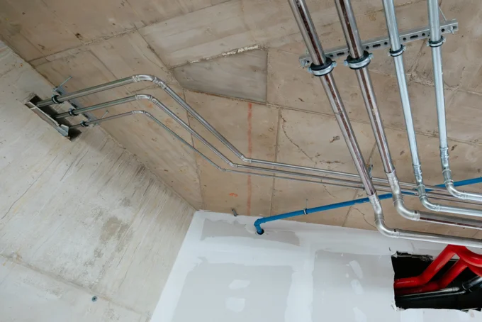 Na gradbišču je bilo mogoče opaziti tudi kombinacijo mešanih inštalacij – od nerjavnih sistemov do debelostenskih črnih cevi – kar je v večjih objektih pogosto nujno za doseganje tehnično in ekonomsko optimalnih rešitev.