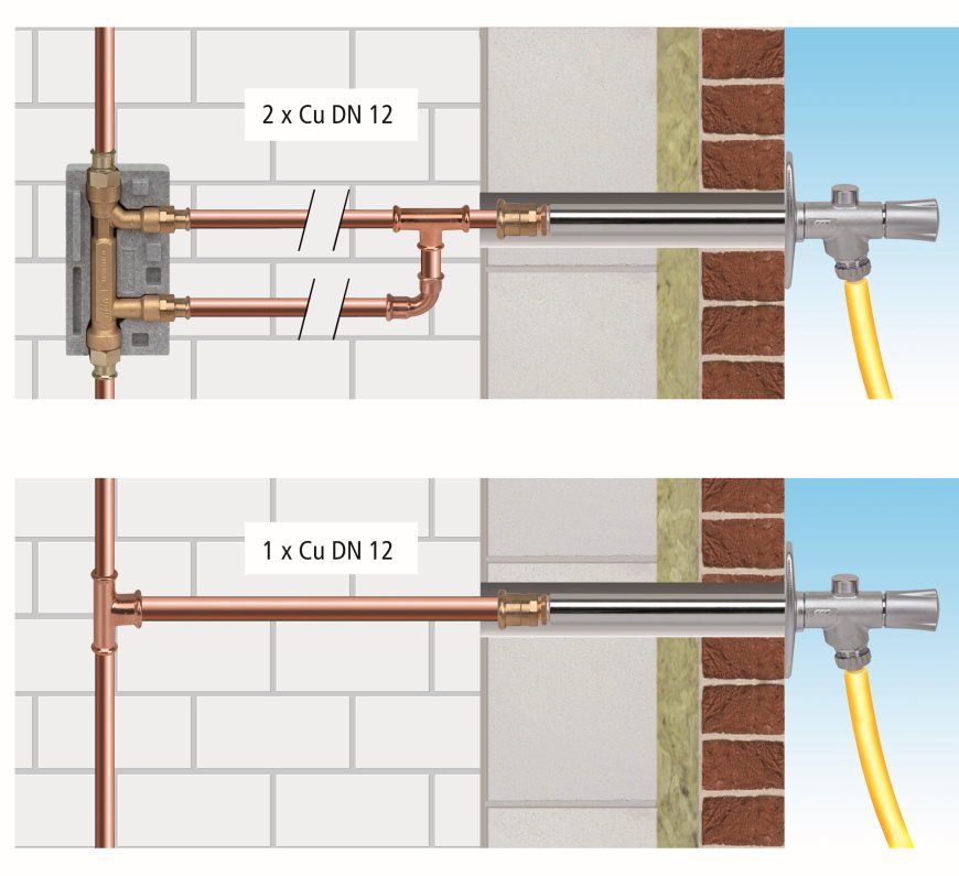 Na voljo je zunanja pipa Kemper Frosti Plus, ki je primerna za novogradnje. Z dodatnim setom jo lahko naknadno preprosto podaljšate in prilagodite debelini vaše fasade.
